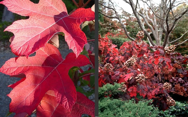 With enormous flower clusters up to 14 inches long, ‘Semmes Beauty’ is an outstanding Oakleaf Hydrangea selected for its vigor and tolerance of the heat and humidity in the South. This magnificent beauty is a 4-season color factory. Large, oak-shaped, dark green leaves emerge in early spring followed by elongated, showy clusters of four-petaled ivory color flowers that turn to a rose-pink in late summer and fall. But the color show doesn’t stop there. Striking shades of crimson and bronze purple foliage light up the fall garden. The flowers dry to a soft tan color and persist through the winter, contrasting nicely with the exfoliating copper-brown, cinnamon and tan bark. The cut flowers are great for use in fresh or dried flower arrangements.